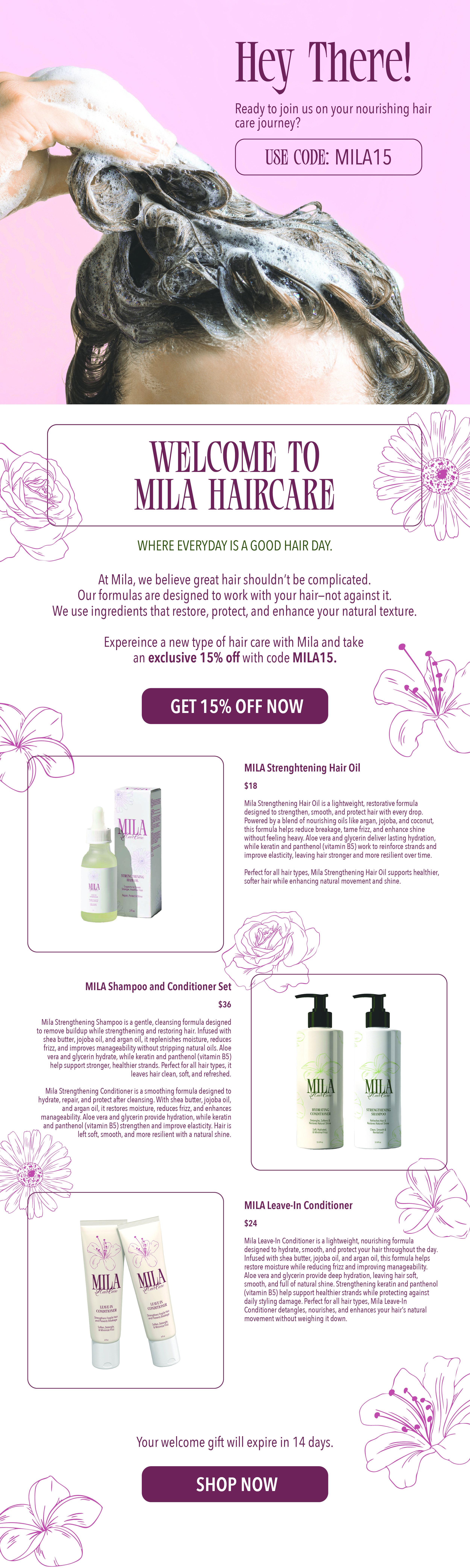 Mila Haircare was created with a simple intention: to make haircare that feels easy, looks good, and works. Every product is designed with care, focusing on the essentials your hair actually needs—nothing more, nothing less. I built Mila around the idea that good design matters. From the formulas to the packaging, everything is clean, minimal, and made to fit naturally into your routine without overcomplicating it. Mila is about keeping things straightforward—products you can trust, a routine you can stick to, and hair that feels healthy every day.